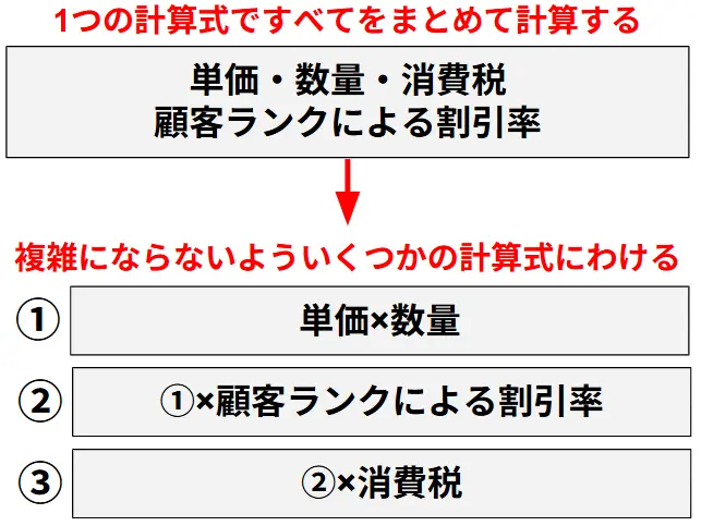 3段階を超えるような複雑な計算になる場合には、以下の図のように計算処理をいくつかの計算式に分けたり、プラグインを導入したりすることで管理がしやすくなるでしょう。