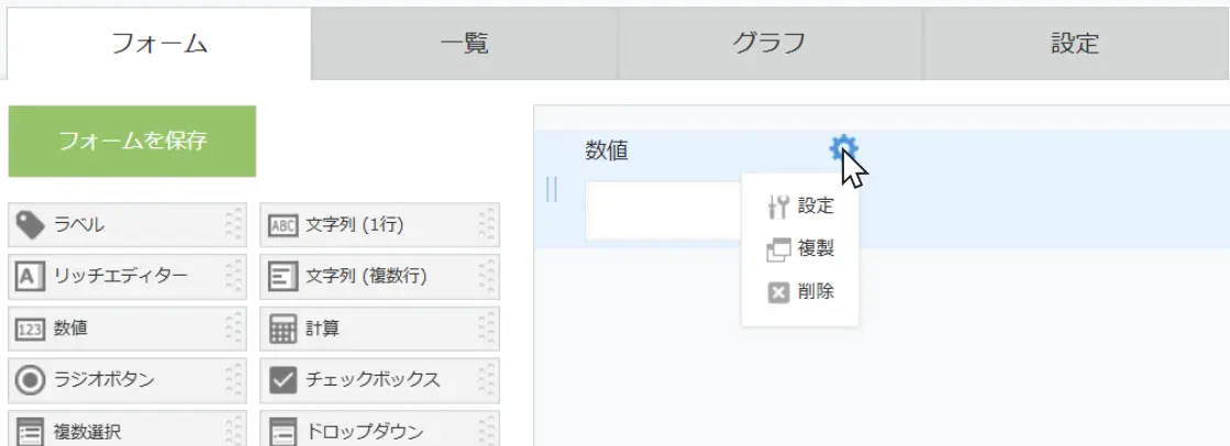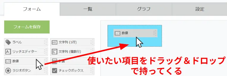 kintoneでは、左側のメニューにある項目の中から、使いたいものをドラッグ&ドロップでフォーム上に配置することができます。今回は、「数値」を選んでドロップしてください。