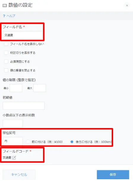 また、この設定時、数字の場合には単位などをあらかじめ設定しておくことも可能です。