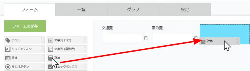 先ほどと同じように、項目で計算を選んでフォーム内に追加しましょう。