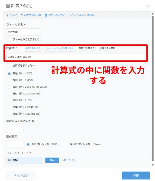 このとき、【STEP2】計算に使う項目を追加するでお伝えしたとおり関数の計算で使うのは「フィールド名」ではなく「フィールドコード」です。間違えてしまうと計算がうまく反映されないため、注意が必要です。