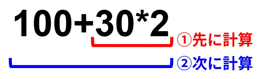 たとえば「100+30*2」という式があった場合、以下のような順番で計算します。 (2)100+60=160 演算子の順番によって計算結果が変わってしまうため、使用時には注意してください。 |