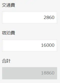 「交通費」と「宿泊費」に金額を入れると、「合計金額」が自動で計算されます。