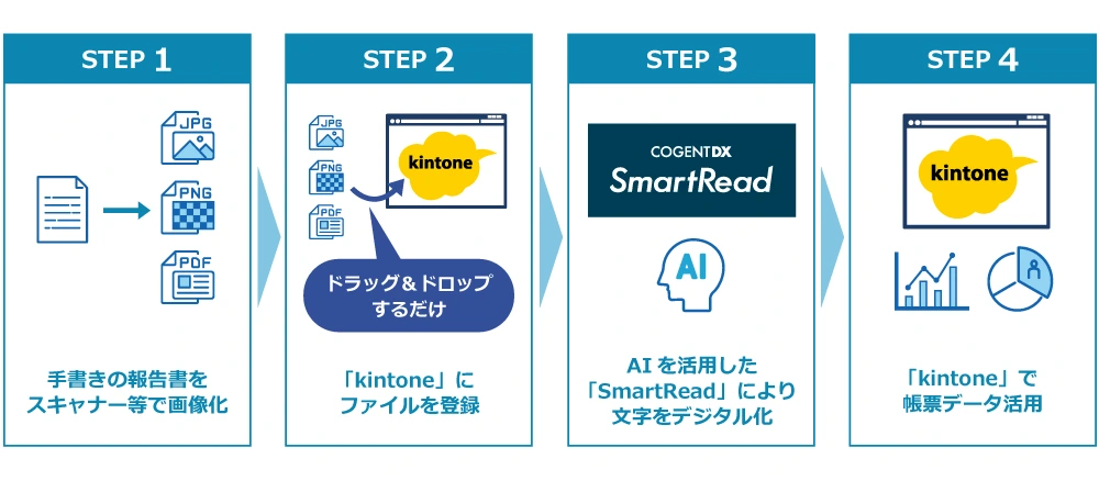 「SmartRead」連携プラグインは、kintoneに書類画像(JPEG、PNG、PDF)をドラッグ&ドロップするだけで、データ化してkintoneに取り込めるプラグインです。