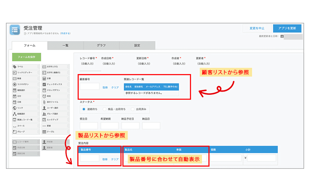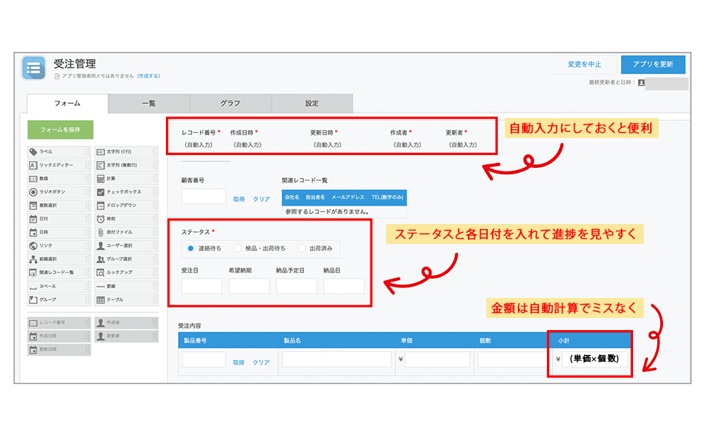 受注・発注管理アプリでは、更新情報がわかるように、「作成日時」「更新日時」「作成者」「更新者」などの項目を入れておくのがおすすめです。デフォルトで自動入力になっているので、入力漏れやミスも起きずに済みます。