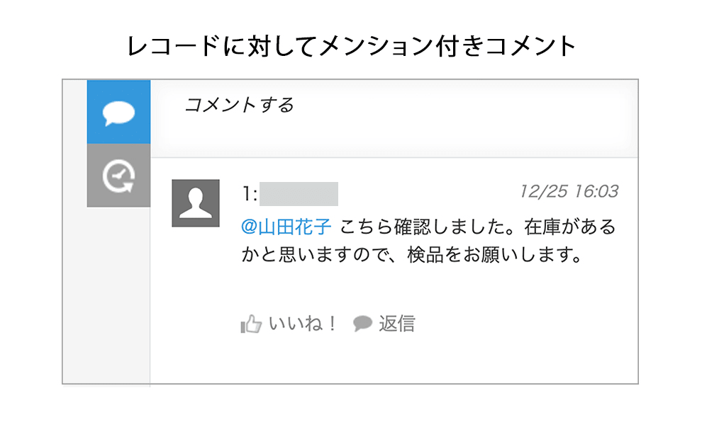受注・発注業務では、社内外で多くのやり取りが発生します。kintoneではレコードごとにコメントを残せるため、案件単位でやり取りを可視化できます。メンション機能を使えば、必要な担当者に直接通知が届くので、情報の見落としも減少します。