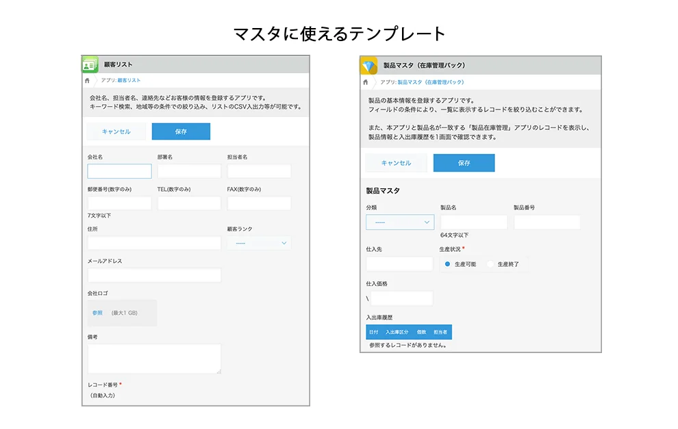 顧客情報・仕入先情報や、製品情報については複数のアプリで参照する可能性があるため、マスタアプリを作っておくのが便利です。kintone内には下記のようなテンプレートアプリがあるので、そのまま使っても、カスタマイズして使ってもいいでしょう。