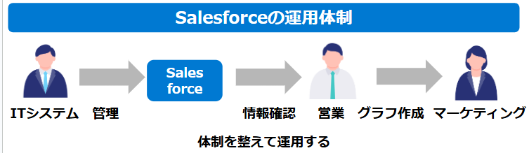 Salesforceは一定の知識がないと目的に応じて使えないことがあります。そのため、ITシステム担当者や特定の営業担当者が軸となり、運用管理していく必要があるでしょう。