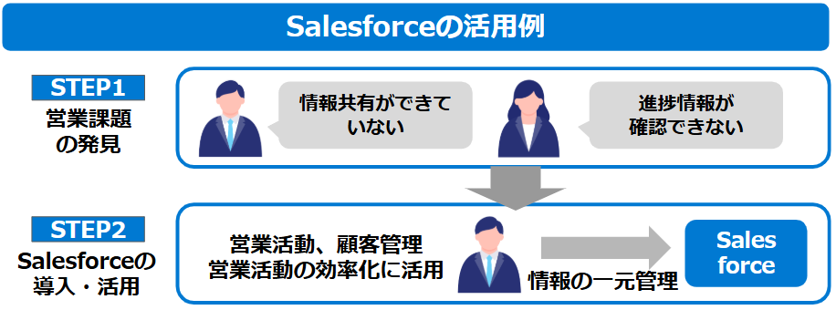 たとえば、営業活動の進捗状況の可視化や機会損失の防ぐために、Salesforceが活用できます。営業活動の管理を個人単位で行う場合、担当者が不在の際に、顧客からの問い合わせに対応できない状況に陥ります。また、売れる営業担当者のノウハウの共有ができず、売上げ自体が個人に依存することもあります。