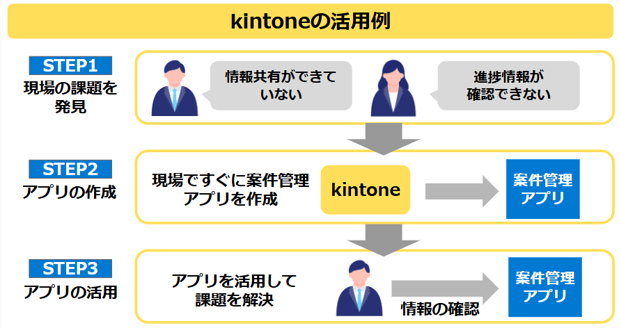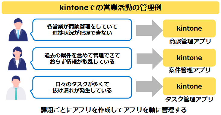 とくに、全従業員を巻き込み、現場主導で業務改善をしていきたい場合はkintoneの強みを最大限に活用できます。たとえば、営業活動を効率化したい場合は、必要なアプリを作成すれば案件管理やワークフロー管理などを始められます。