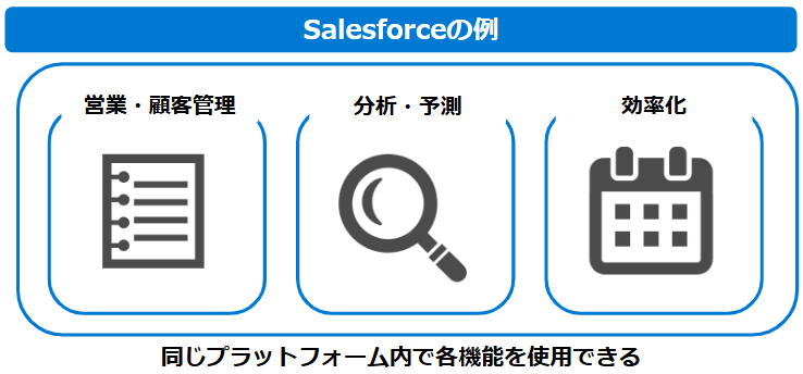 Salesforceは1つのプラットフォーム上に「営業」「顧客管理」「営業活動の予測」「分析」など、業務の効率化ができる機能が集約されています。kintoneのように、複数のアプリを作成して、それぞれのアプリを使う必要はありません。全機能を1つのプラットフォームで扱える点が大きな違いです。