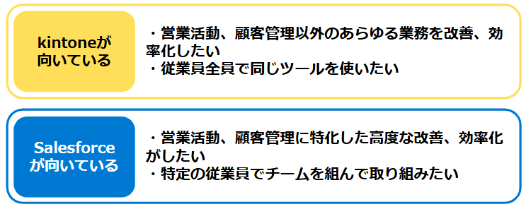 kintoneは、さまざまな業務改善や効率化を目指して、従業員全員で取り組みたい場合に活用できます。一方、Salesforceは、営業活動や顧客管理に特化して、より高度な施策に取り組みたい場合の活用に適しています。