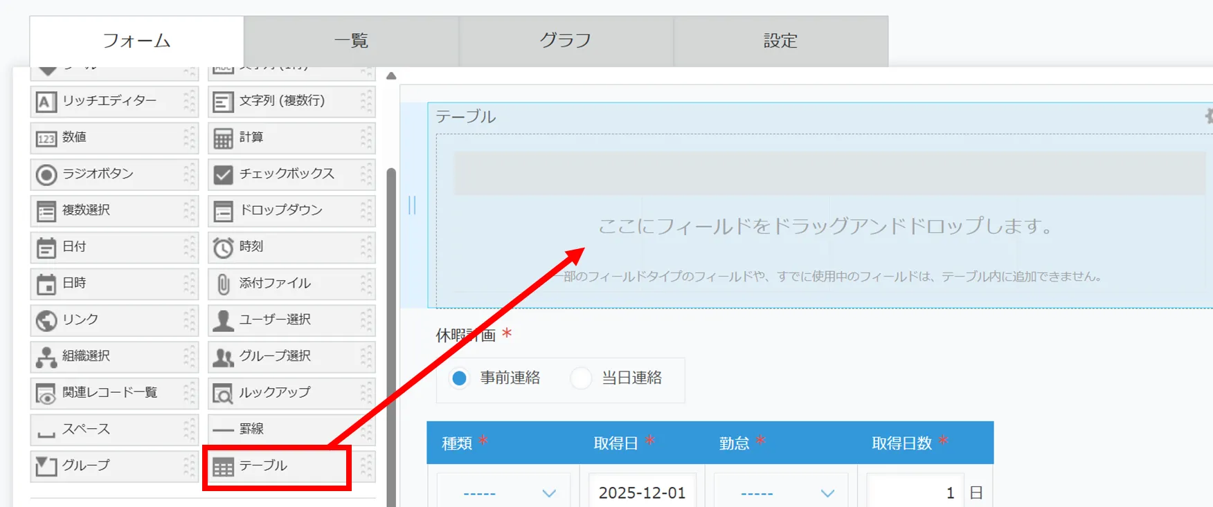 たとえば、下の図のように、アプリの設定画面で「テーブル」を選択してドラッグアンドドロップで置いたうえで、折りたたみたい入力項目をドラッグアンドドロップでまとめられます。スクロールを減らすための手段の1つとして活用してみてください。