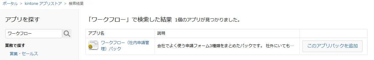 次に、アプリストアで「ワークフロー」などと検索し、「ワークフロー(社内申請管理)パック」を追加します。