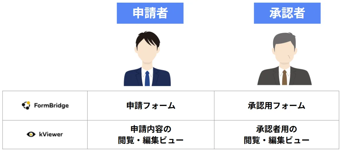 そこで、「FormBridge」と「kViewer」で申請者と承認者それぞれにフォームとビュー(閲覧画面)を作成し、kintoneアプリと連携(※)することで、kintoneユーザー以外を含めたワークフローを構築できます。