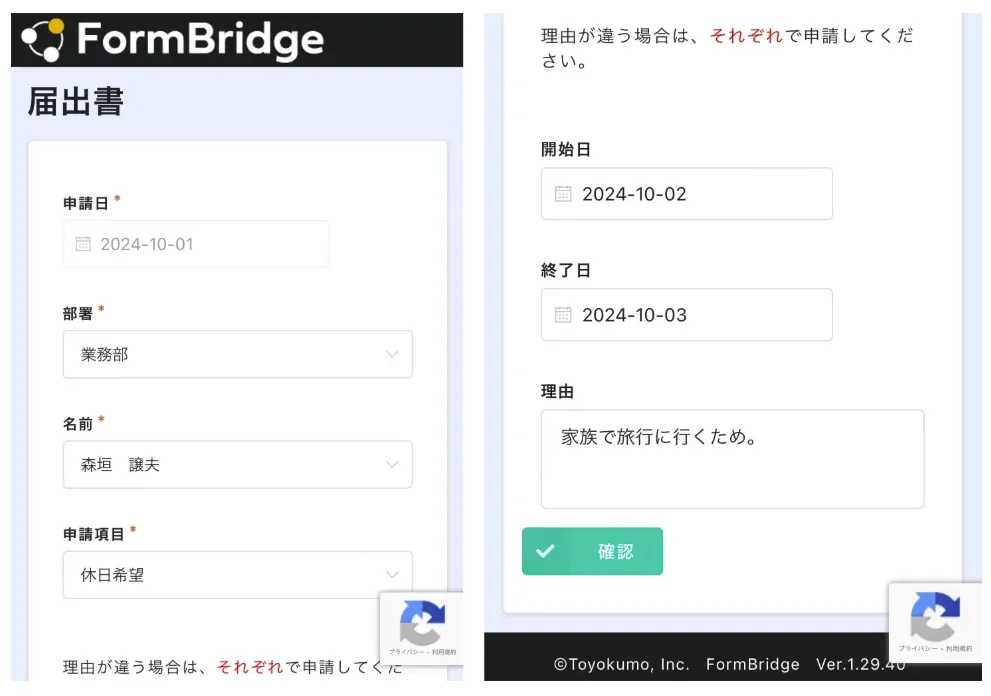 そこでトヨクモの「FormBridge」を活用し、kintoneアカウントを持たないスタッフもスマートフォンのフォームから有給申請できる仕組みを構築しました。申請内容はkintoneに自動登録され、管理者はkintone上でそのまま承認処理を行えます。