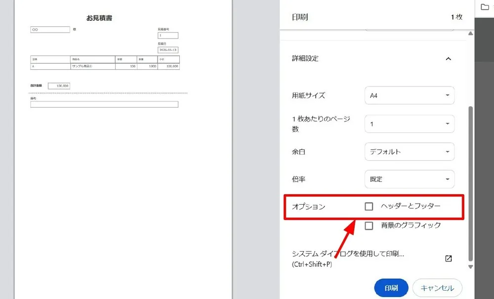 印刷プレビュー画面で確認すると、以下の通り非表示になっていることがわかります。