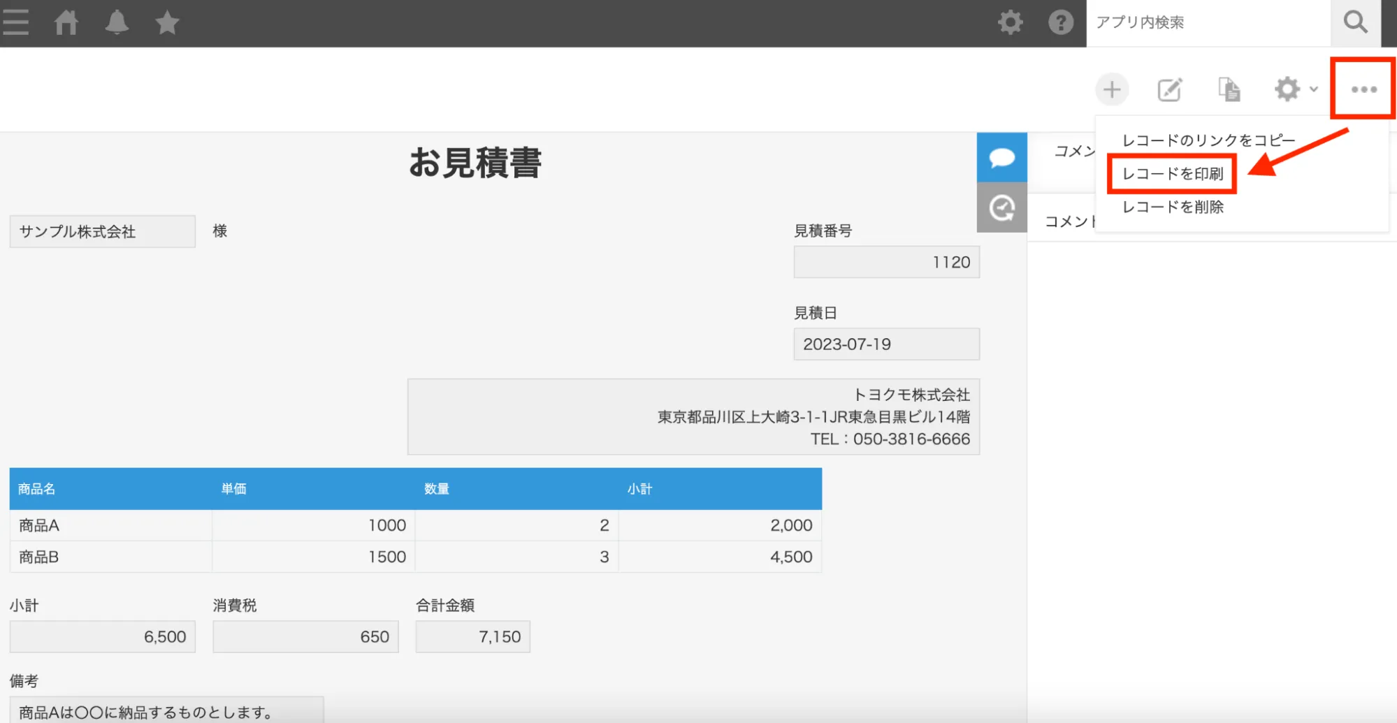 レコード詳細画面>右側の3点リーダーをクリック>レコードを印刷を選択します。