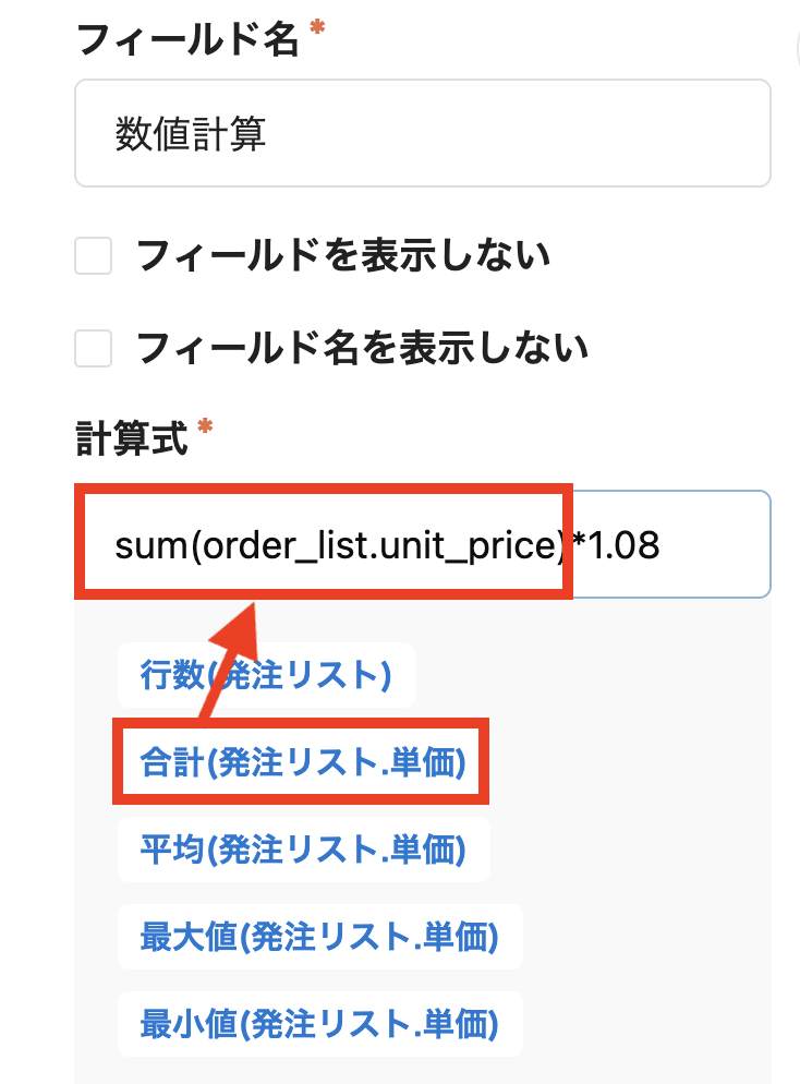 続いて、税抜の合計金額が計算される設定をします!画像のように、フィールド名を「合計金額(税抜)」にして、計算式の欄に「合計(発注リスト.単価)」を追加すればOK!