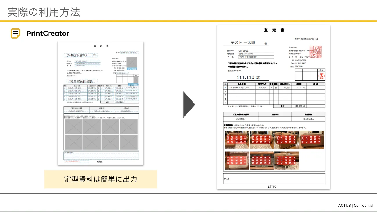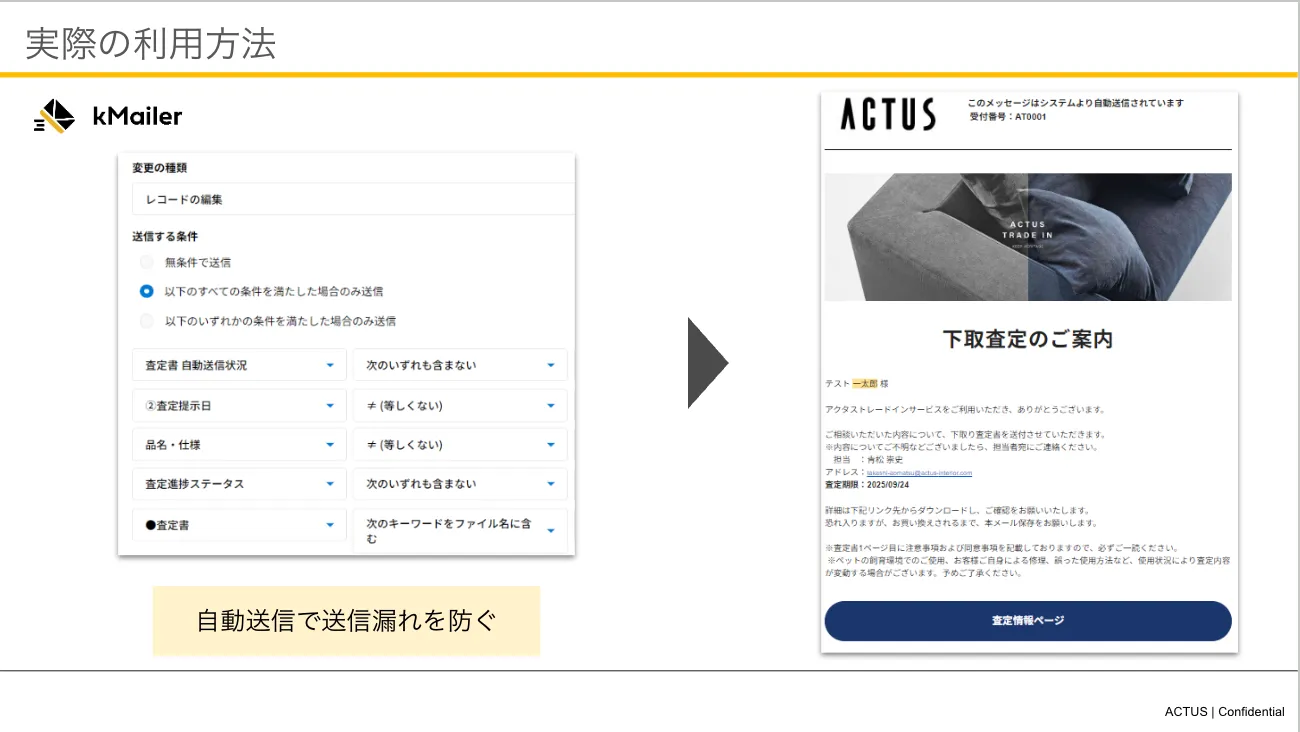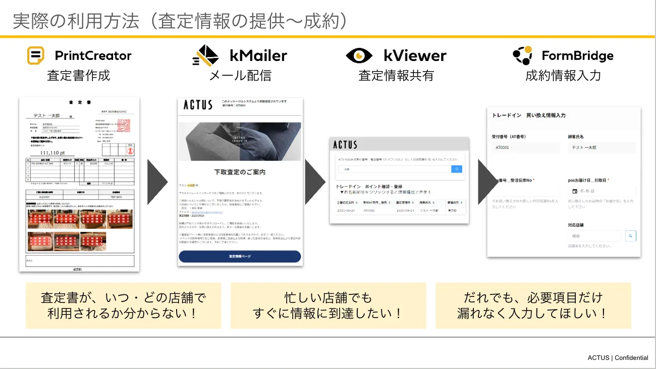 実際の流れでは、一番最初はPrintCreatorを使って査定書を作ります。出力した査定書はkMailerを使い、個人のお客様にメールでお送りします。