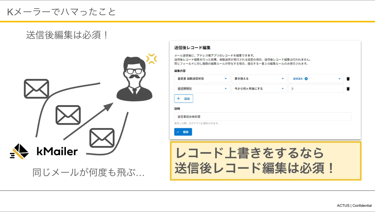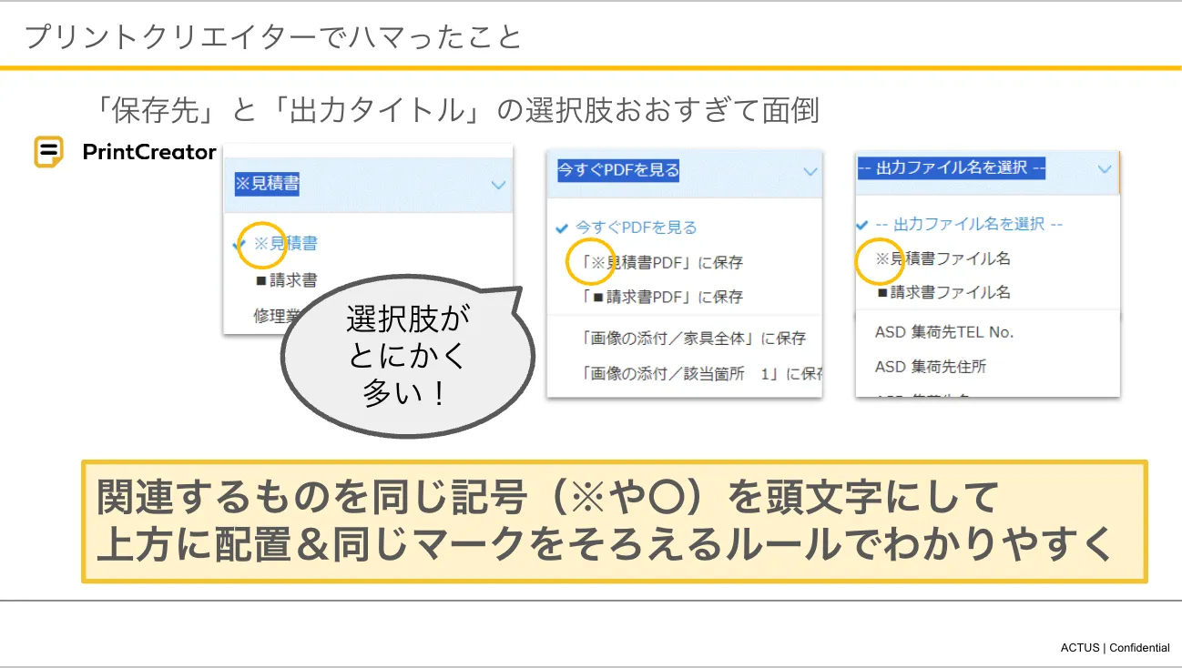 PrintCreatorでも失敗はあります。kintoneの同一アプリ上で様々な書類が作成可能なので、それぞれをレコード保存する必要があるのですが、「保存先」の場所と「出力タイトル名」の選択肢が多い。そのために当初は各々が別のやり方をしたために混乱したり、出力タイトルを間違って選択したりというミスが起きました。今は関連するレコードは同じ記号を頭文字にして情報に配置するなどルールを決めてわかりやすくしています。