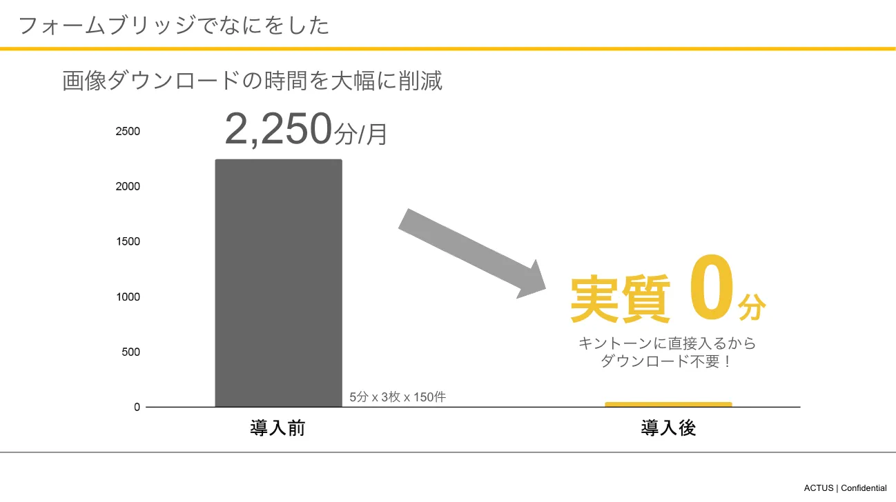 FormBridge導入の結果、大きく削減できたのが写真のダウンロード時間です。修理の相談時には写真を3枚以上お送り頂くのですが、以前はそのダウンロードに1枚5分程かかっていました。1ヶ月に約150件の相談があるとすると、ダウンロード時間だけで2250分です。