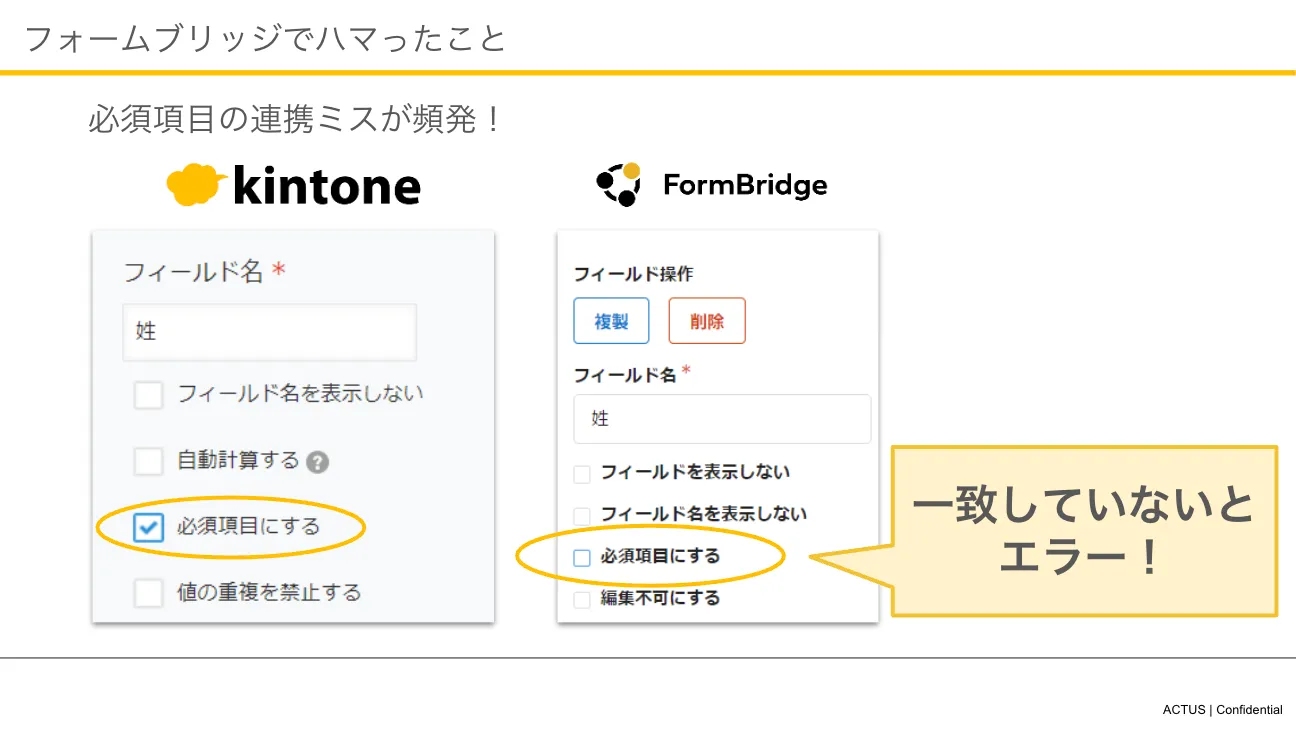ただ、フィールドの設定をする際に「必須項目にする」という設定がkintone側、FormBridge側の両方で一致していなかったため、FormBridge側で回答はできるがkintone側で入力エラーになる、ということがありました。これは今でもたまにやってしまうエラーです。