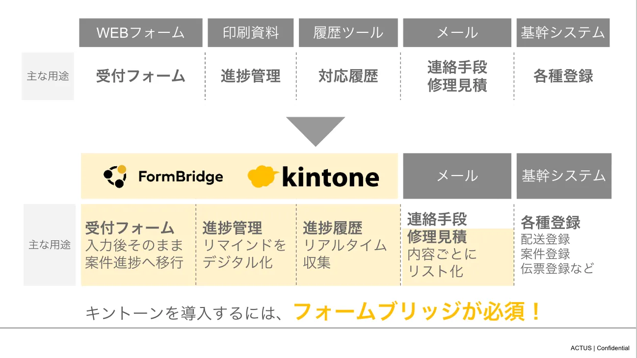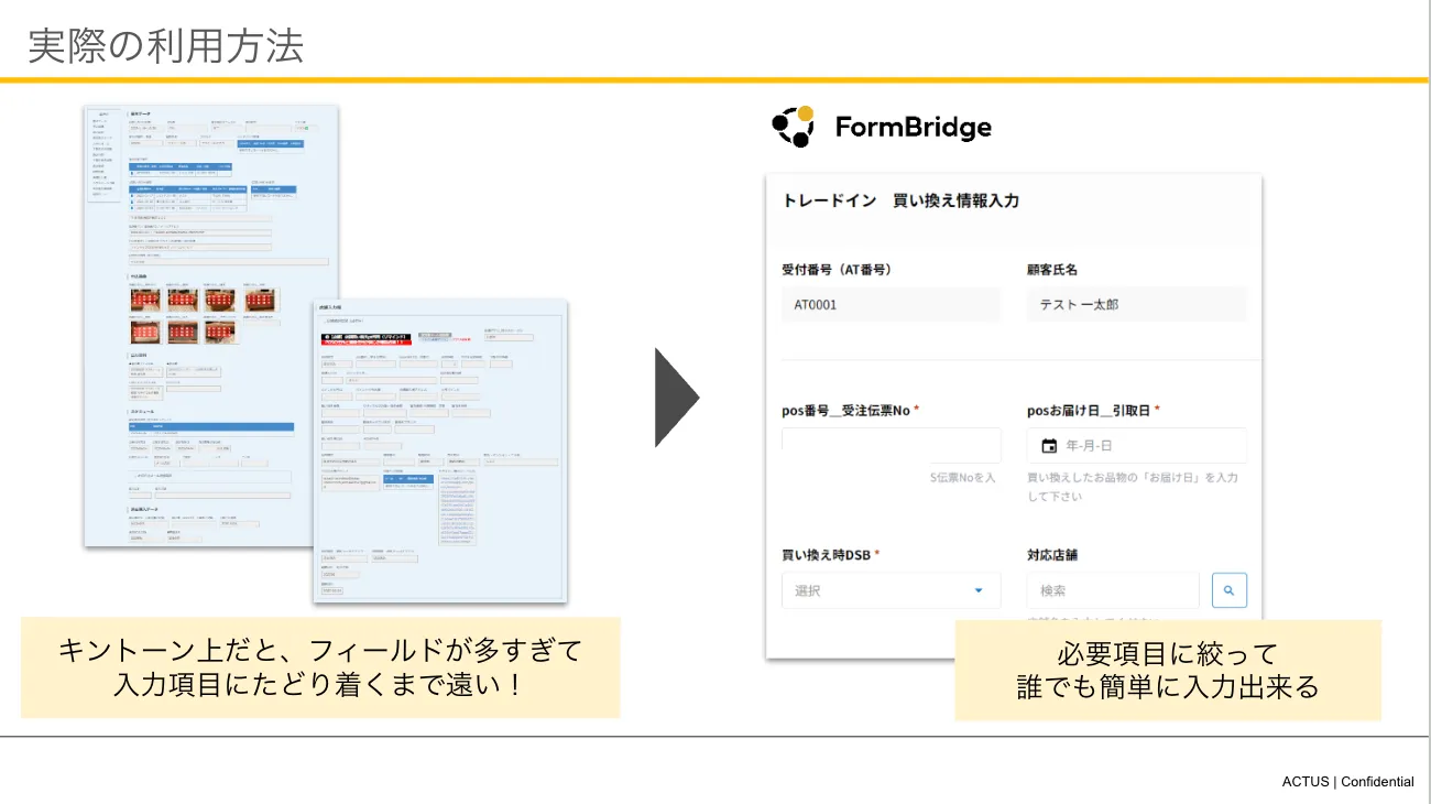 一方、導入を進める中でkintoneだけではお客様に入力してもらうための受付フォームを作れないことが分かりました。そこでベンダーさんにご紹介頂いたのがFormBridgeでした。