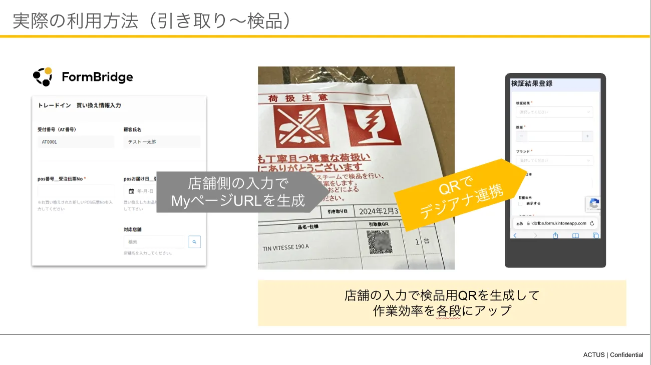 最後の5については、4のFormBridgeを使った店舗側の情報入力のタイミングで、引き取った商品ごとのマイページURLを作っています。このURLをPrintCreatorでQRコードとして出力して現物に貼り、検品の時にスマホで読み込んで検品情報を入力します。