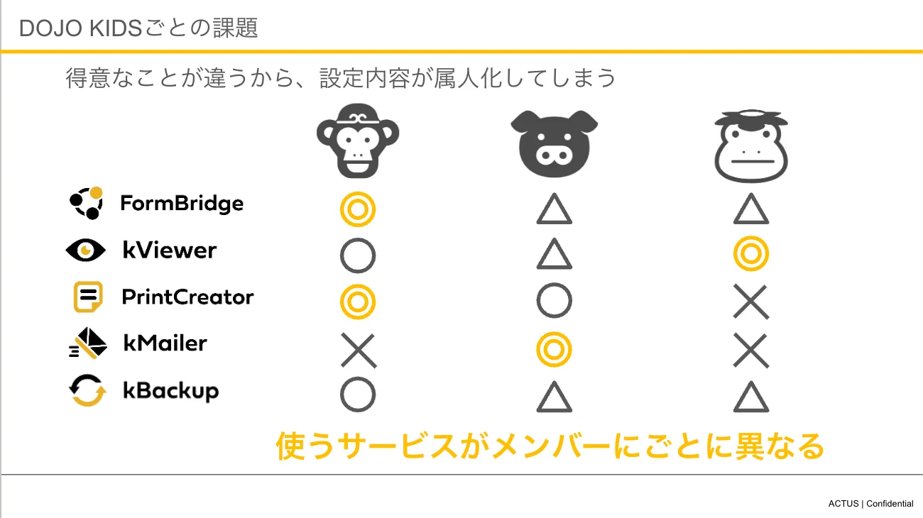 でもこの些細な違いが、kintoneのアプリ同士を連携させようとした時に大きな障害になったりするので、それは問題だという話になりました。そのため、以前はなかったkintone全体のルールを今、少しずつ作り始めています。