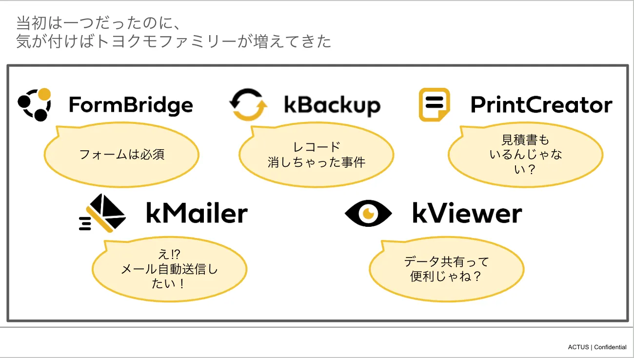 こうしてFormBridgeから導入を始めたトヨクモ製品ですが、今は合計で5つの製品を利用しています: