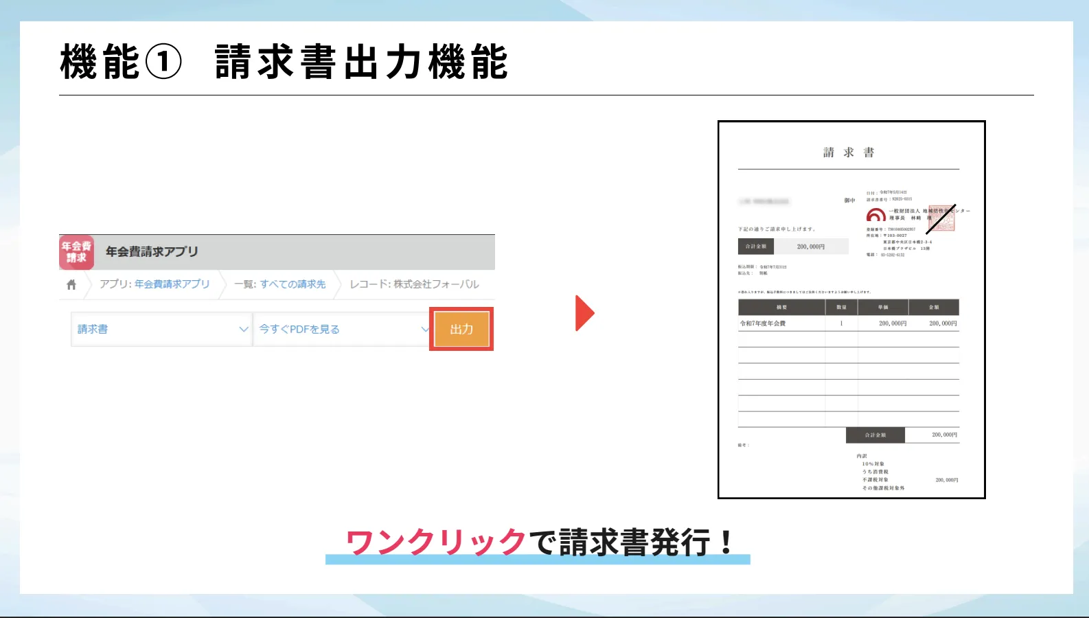 発行した請求書は年会費請求アプリのレコードに保存し、その状態でkMailerでメールを送れば会員団体様に請求書を発送できます。