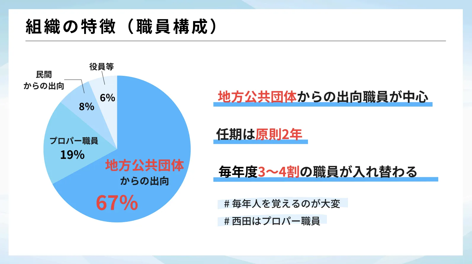 出向者の任期は原則2年のため、全体の約 3〜4 割の職員が毎年入れ替わる特殊な組織です。この性質上、業務の標準化や効率化を求めることが常にテーマになっています。