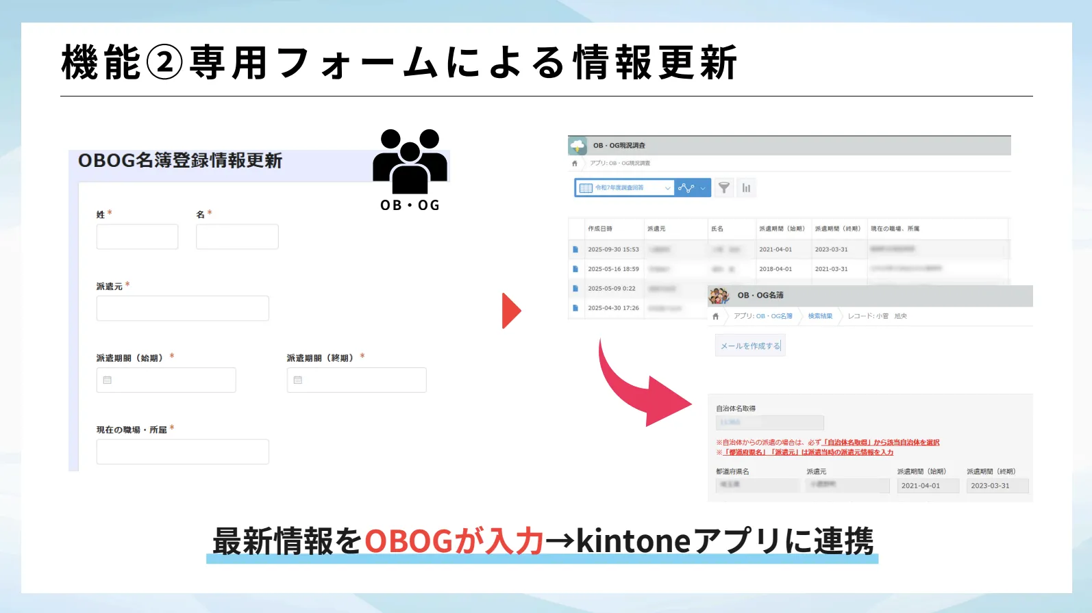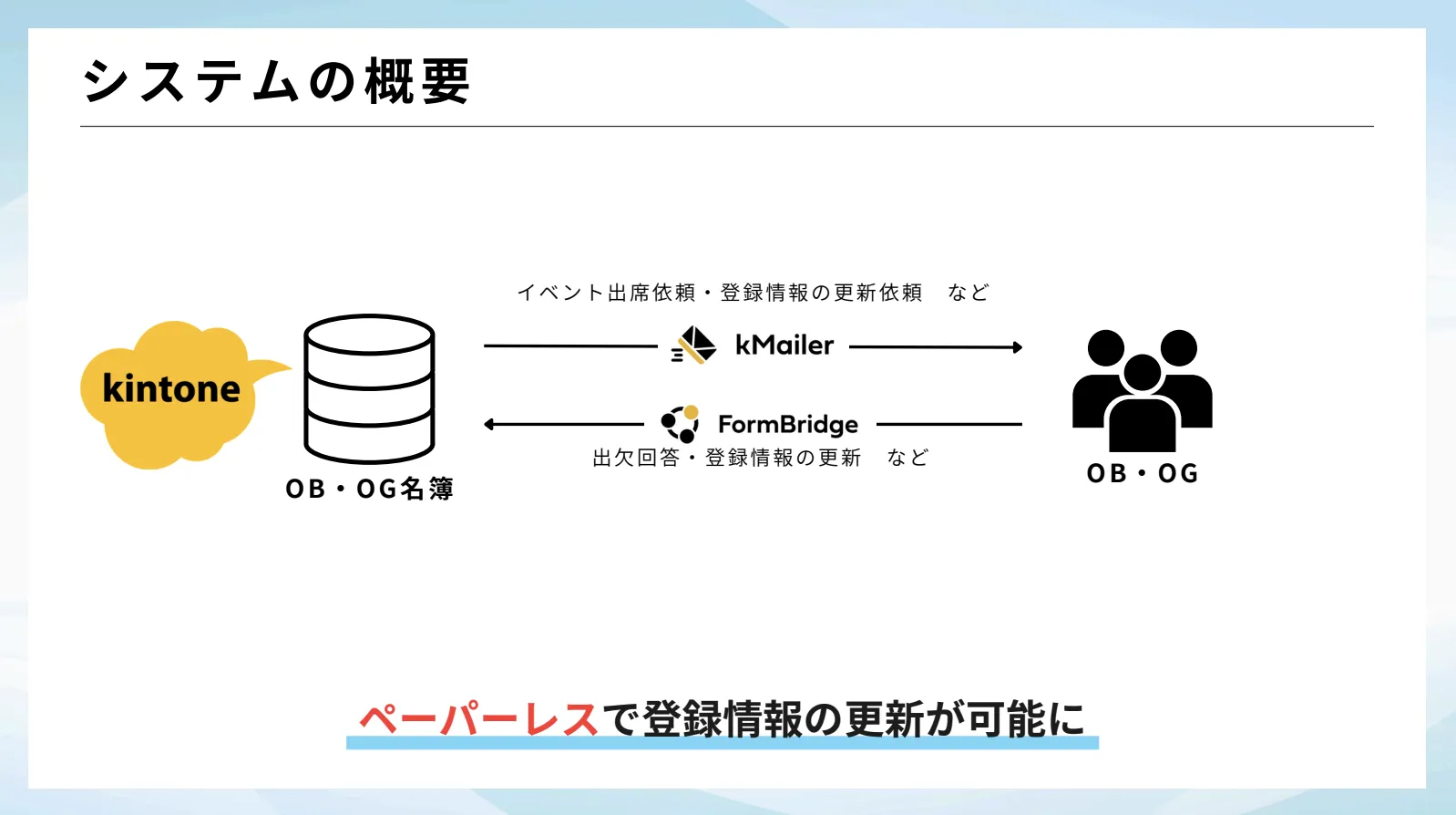 登録情報更新依頼メールにFormBridgeで作成したフォームの URLリンクを入れておきます。メールを受け取ったOBOGがフォームにアクセスして情報を入力してもらうことで、その内容が直接kintoneに登録されます。これによりペーパーレスで登録情報の更新が可能になりました。