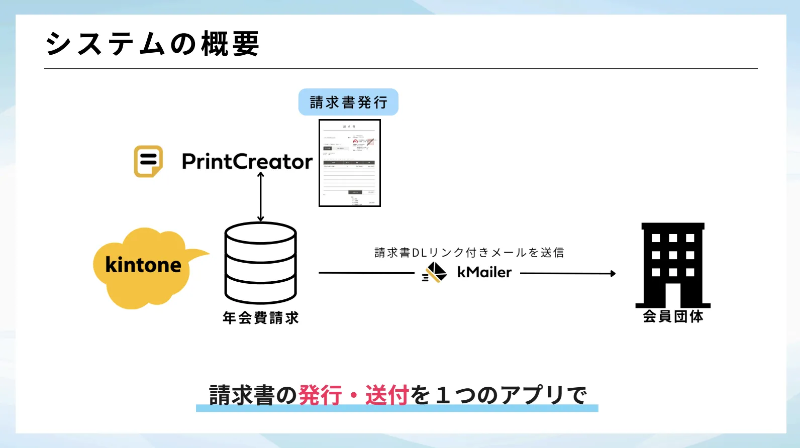 下図がシステムの概要で、年会費の請求アプリに登録された会員様の情報を参照して、PrintCreaterで請求書を発行します。