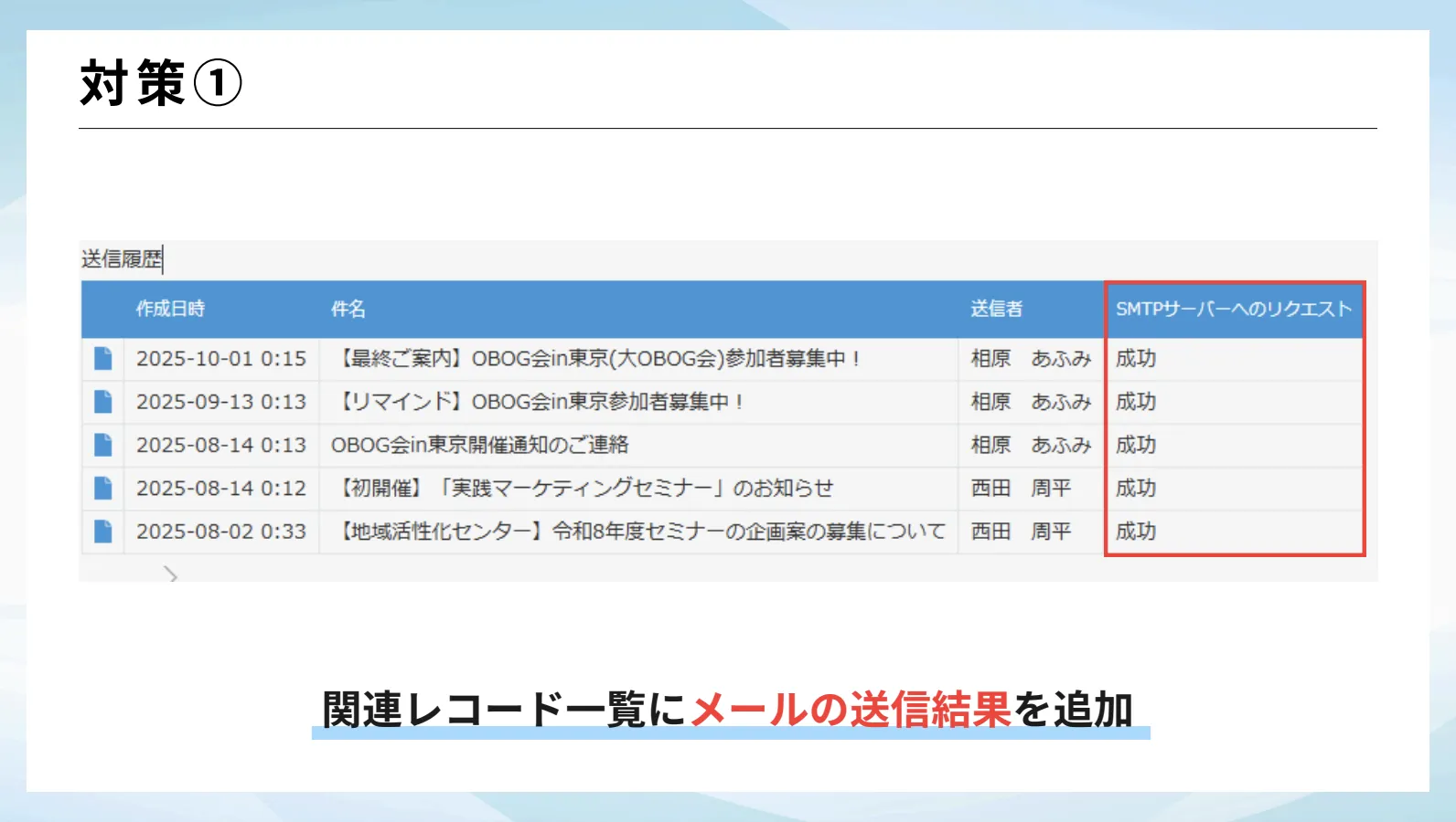 1つ目は連絡先を管理しているレコードに関連レコード一覧フィールドを設け、メールの送信履歴を表示させるようにしました。タイトルや送信日、送信の担当者のほか、送信リクエストが成功したかということも表示するようにしたのです。