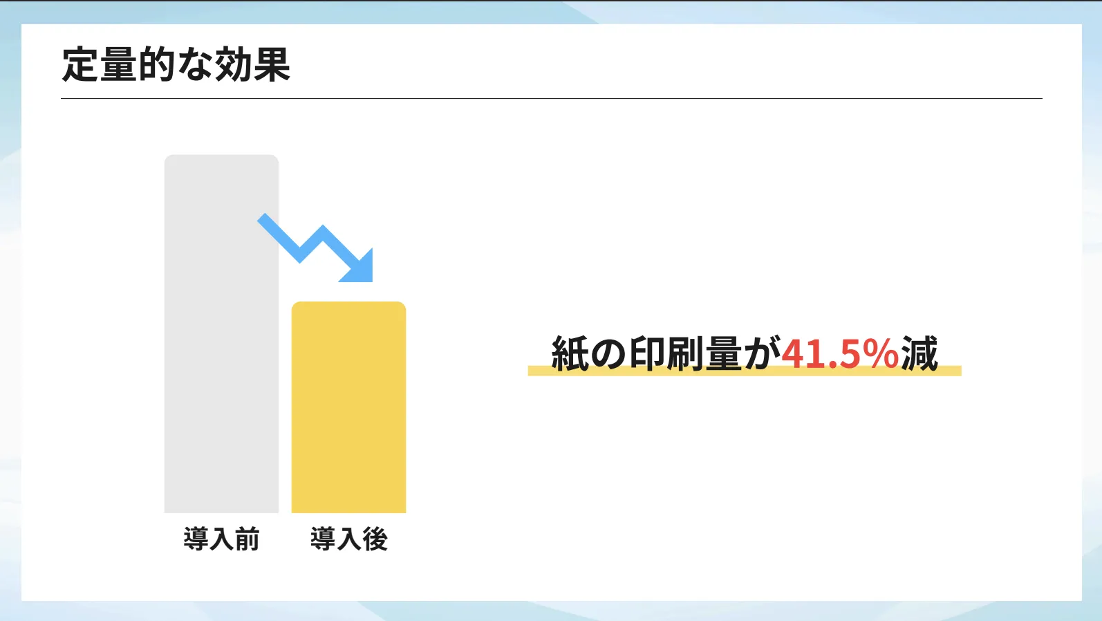 結果として、kintone 導入前には紙と印鑑だった決裁は電子化でき、机上の書類の山や決裁書類が詰め込まれたロッカーもきれいになりました。そして紙の印刷量は41.5%も減少し、当時3台あった複合機を2台に減らすこともできて、コスト削減にもつながりました。