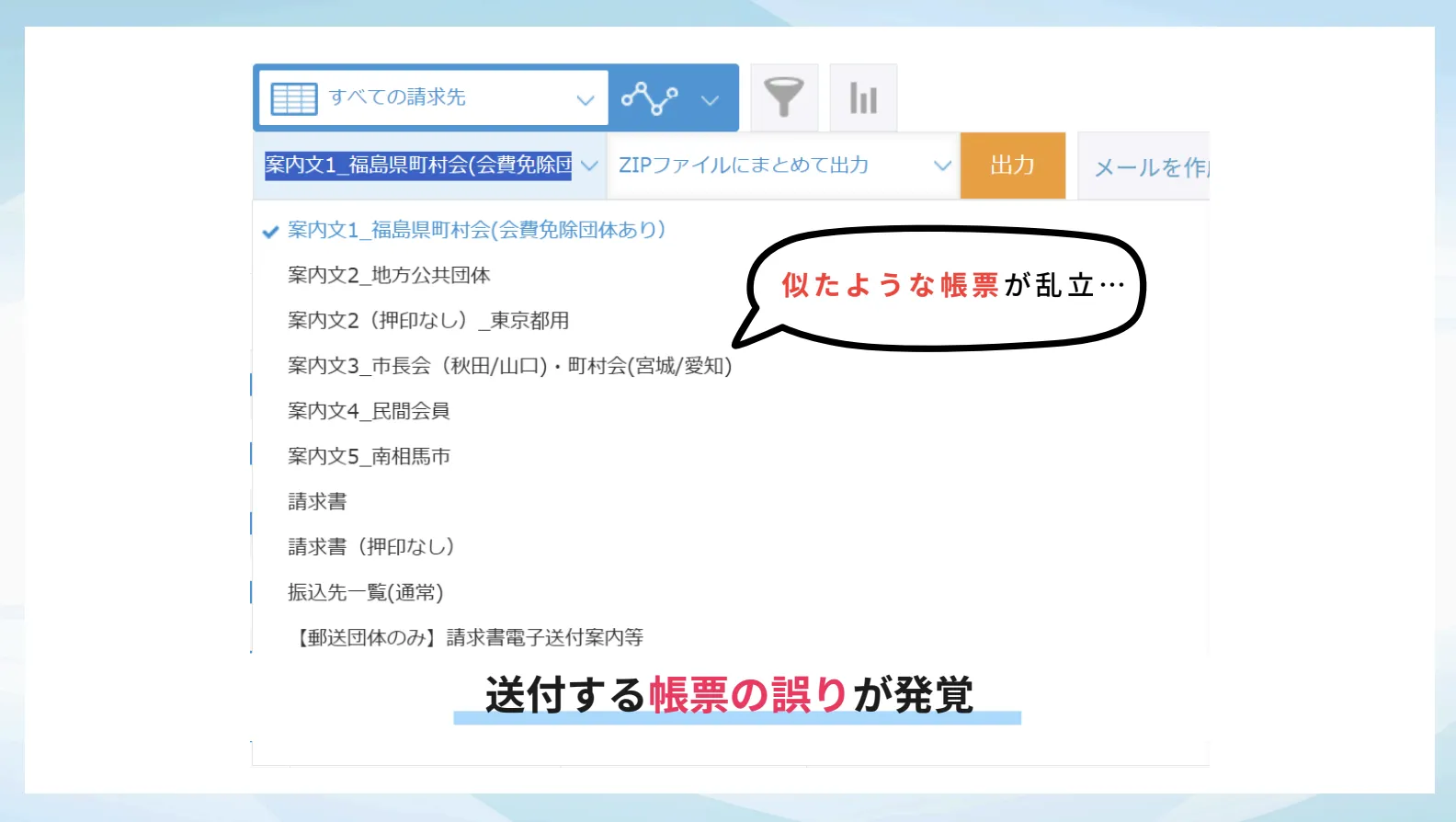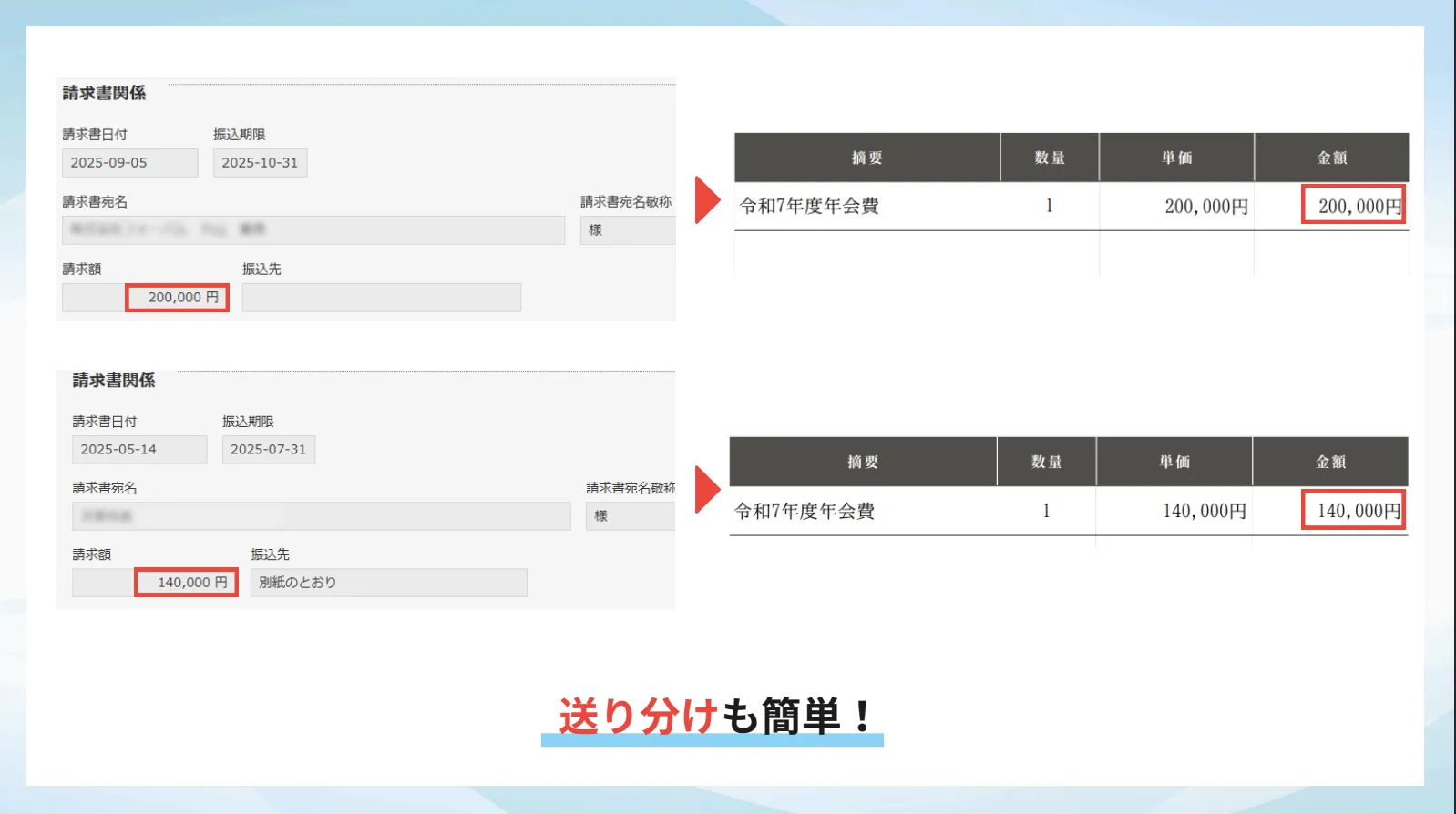加えて、会員様の区分によって請求額が違ったり、記載事項について個別のご要望がある場合は請求書を送り分ける必要もあります。