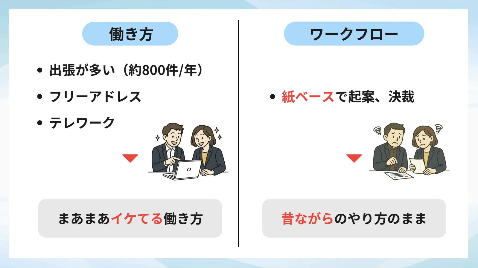 オフィスに人があまりいない、いたとしてもどの席にいるか分からない状況と、紙で業務を行うことの相性の悪さは想像できるのではないでしょうか。
