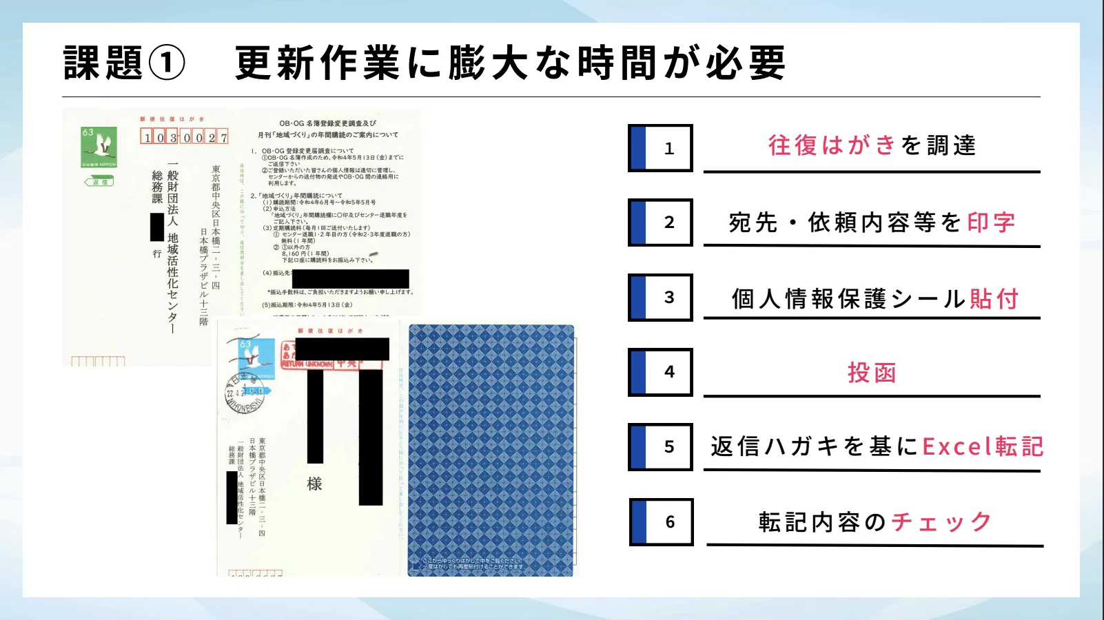 これだけでも大成功でしたが、紙の業務はまだ残っていました。代表的なものは OBOG名簿の管理業務と、年会費の請求業務の2つです。