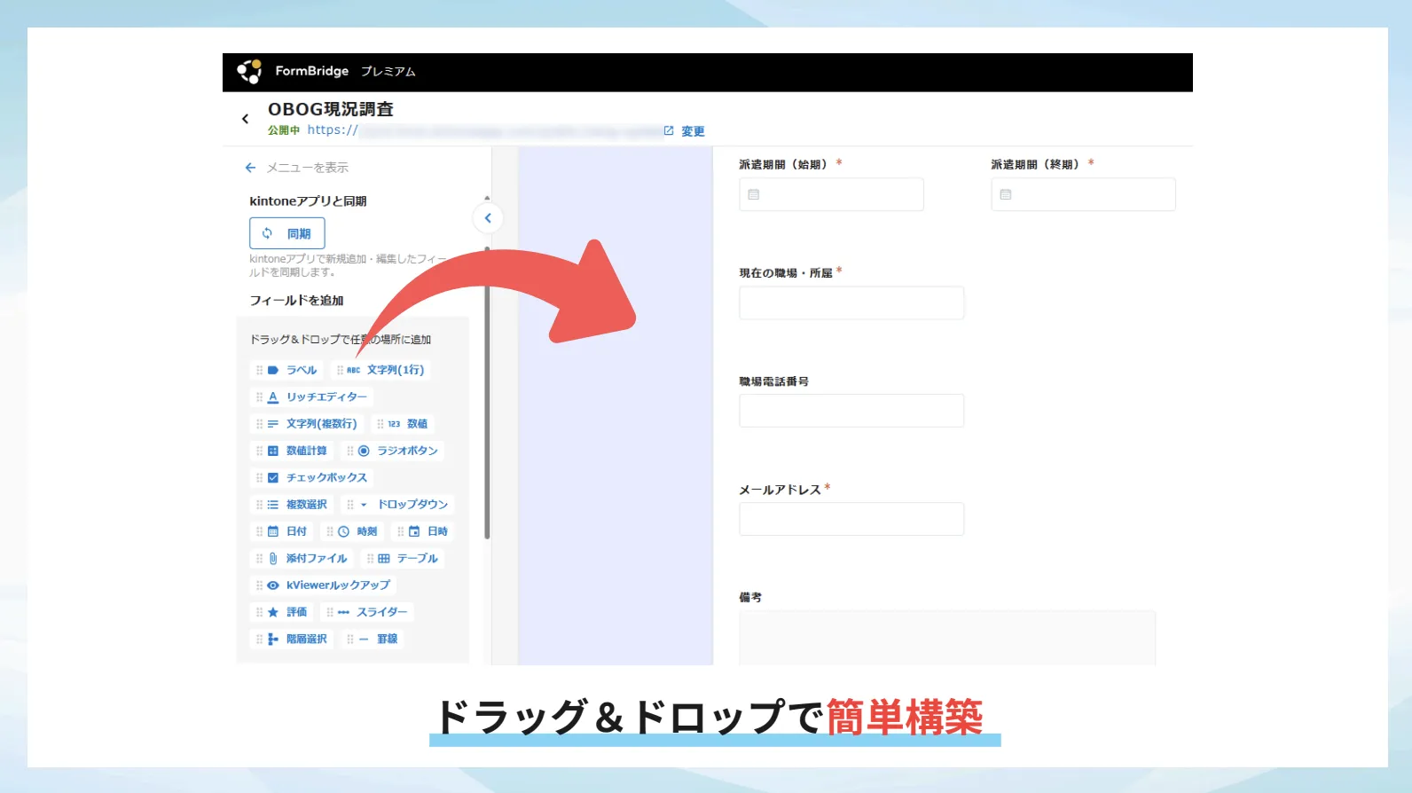 下図はFormBridgeの管理画面です。kintoneの設定画面と同じく、ドラッグ&ドロップでフィールドを移すだけで簡単に構築可能です。