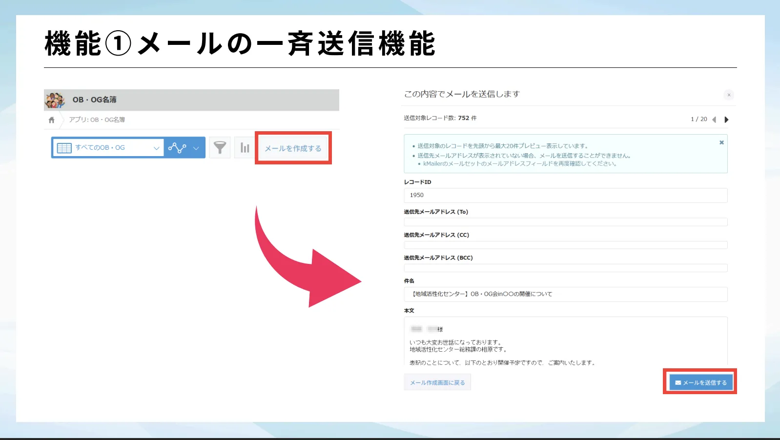 そして、送付先の絞り込みもできます。例えば直近の二年間で派遣されたOBOGに情報を提供したいという場合にも、kintone上で絞り込みを行い、その結果に対してメールを送れます。