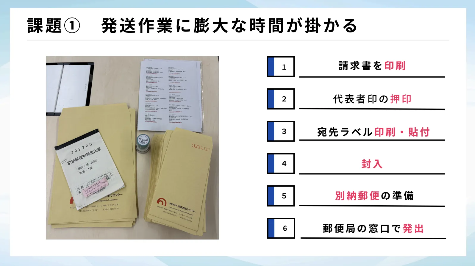 業務としてはまず請求書を印刷、次に我々の代表社印を押印し、そして宛先のラベルを印刷して貼り付け、封入します。郵送にあたっては重さを測り、料金別に表を作ります。それを持って郵便局の窓口に行き、郵送するという流れでした。