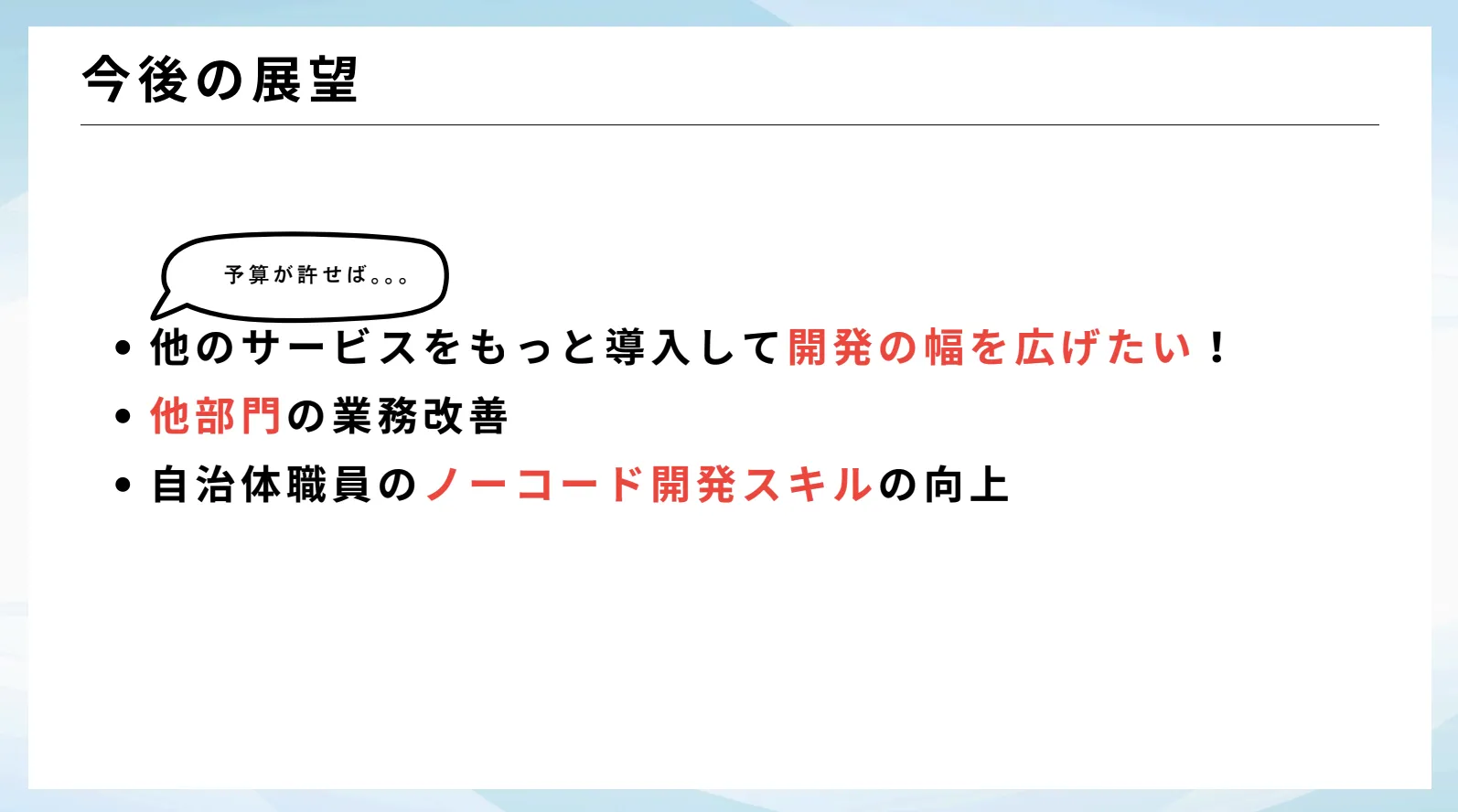 最後に今後の展望をご紹介します。トヨクモさんでは我々が使う3つのサービスの他にも、DataCollectやkViewerなど、様々なソリューションを提供しています。予算が許せば、ぜひそれらも導入して開発の幅を広げたいと考えています。