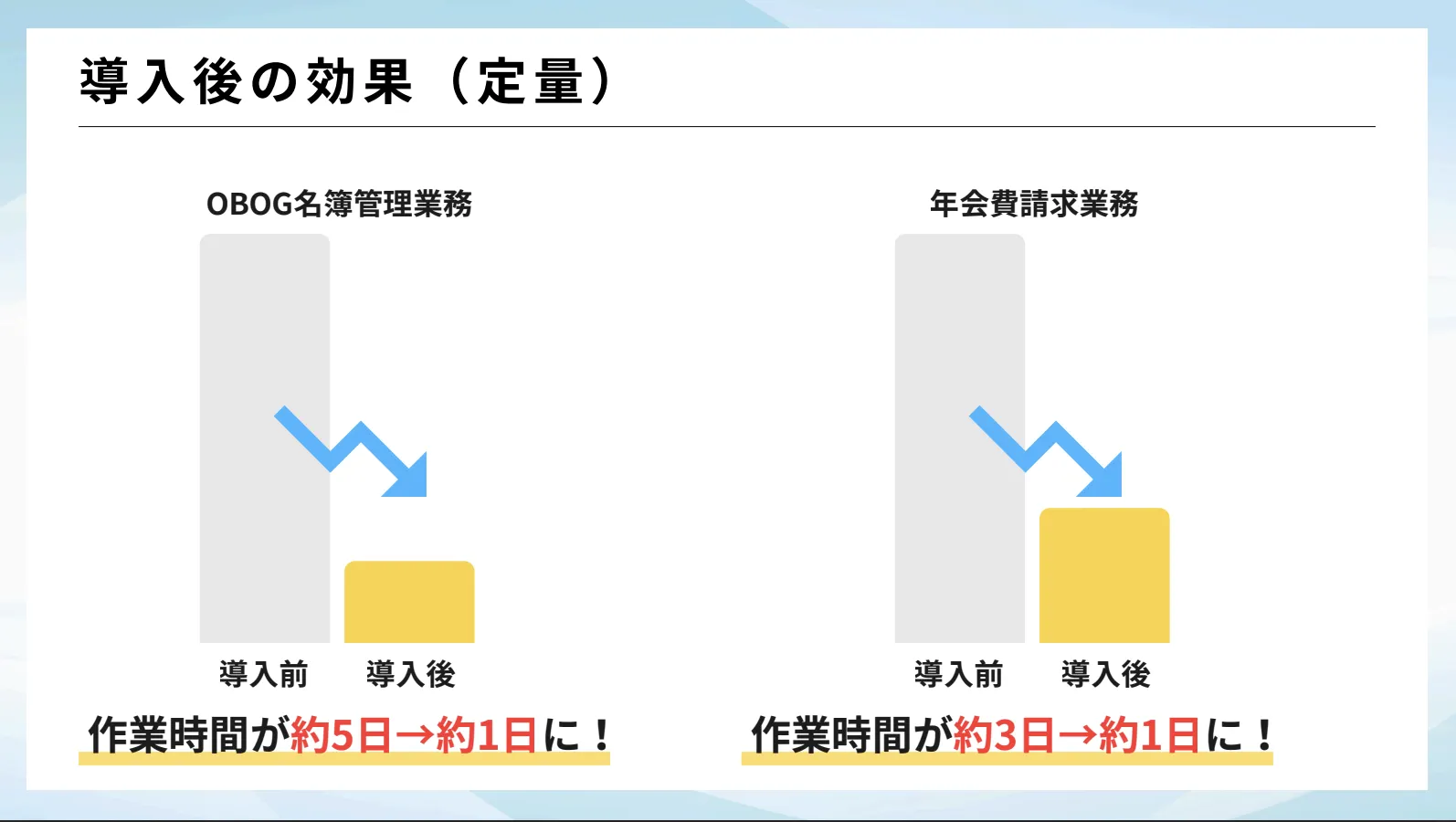 これら取り組みの結果、OBOG名簿の管理業務に関しては5日程度かかっていた業務が1日で終えられるようになりました。また、年会費の請求業務も、3日程度必要だった工数が今では1日あれば十分です。