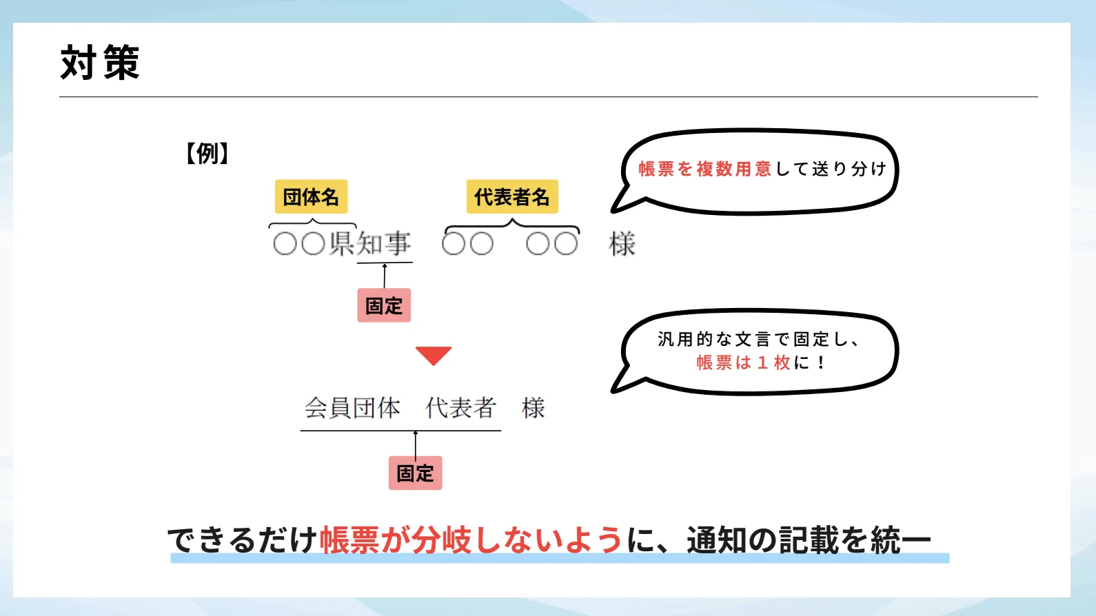 例えば、下図の宛先のように、「会員団体代表者様」というように固定すれば、帳票が「団体名」「代表者名」に分岐せず一枚で済みます。このように出力する帳票を迷わせないようにすることが、今後のミスを防ぐことにつながると考えています。