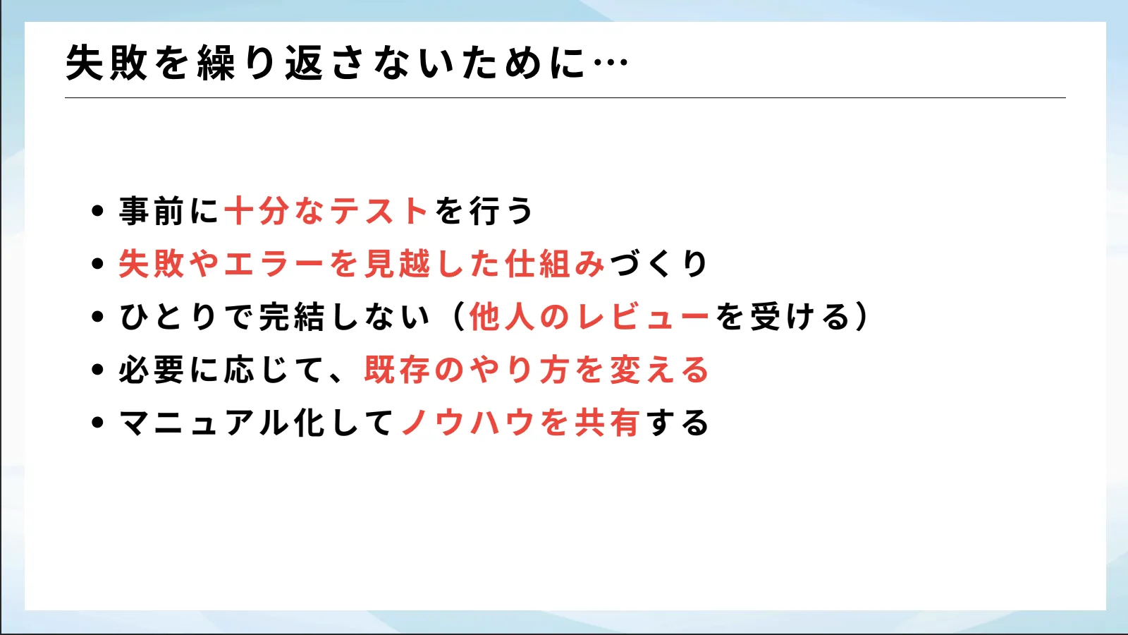 それから失敗やエラーは必ず起こるという前提を持ち、起こった時にどうするかなど、それを見越した仕組み作りをすることが大事だと思っています。