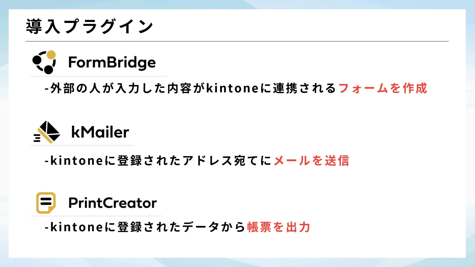 我々が導入しているのはFormBridgekMailerPrintCreaterの3つです。ここから、それぞれを活用した業務をご紹介します。