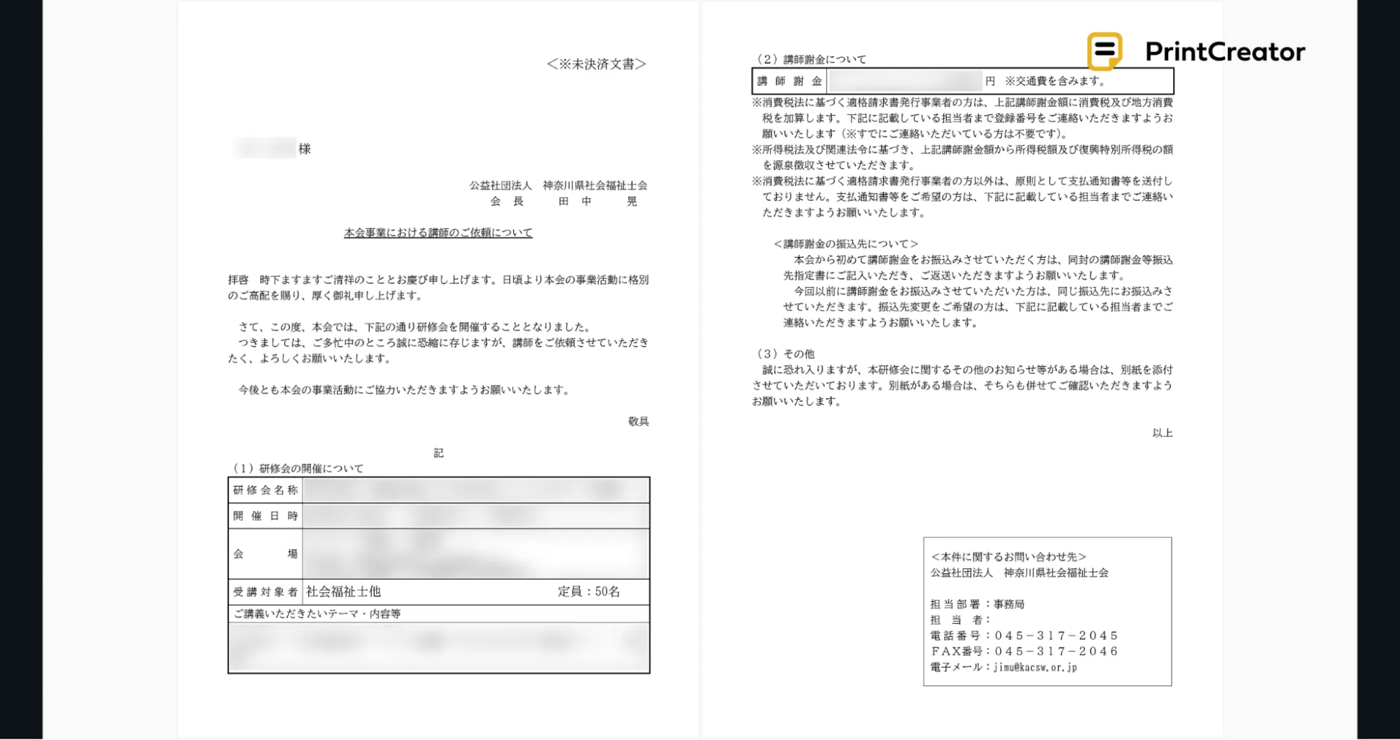 会内部で承認プロセスを回し、承認をもらったあとは、PrintCreatorで正規の講師依頼状を作成します。