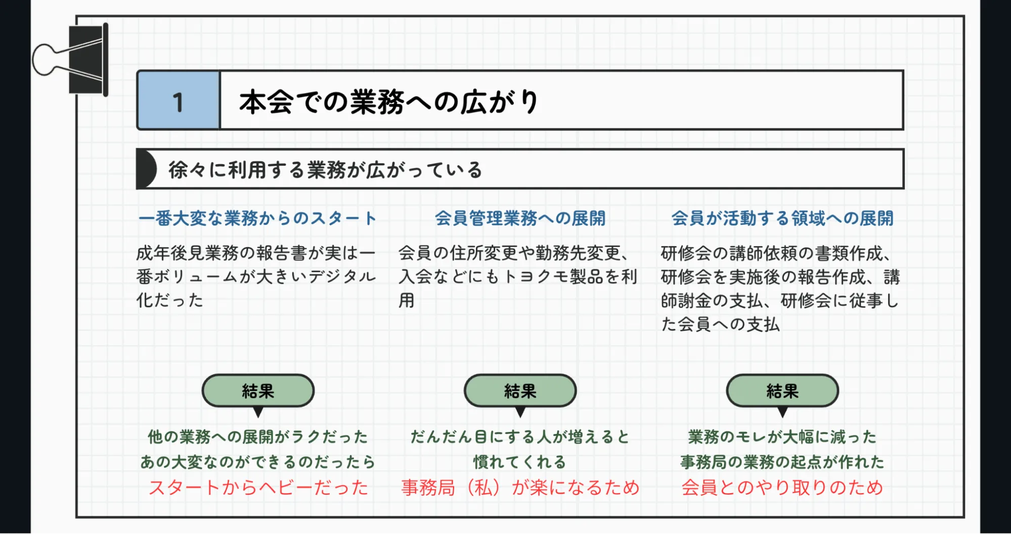 最も大変だった成年後見業務のデジタル化からはじまり、会員管理業務へ展開し、現在は研修会に伴う書類作成など、会員が活動する領域へと展開しています。